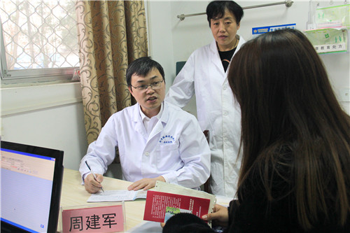 當日上午一大早,來自南京鼓樓醫(yī)院生殖中心的孫海翔、周建軍、劉景瑜三位“生殖界”醫(yī)學大咖出現(xiàn)在安慶市石化醫(yī)院,而此時,等候他們到來的50多名患者擠滿了一樓專家門診室??吹綄<覀兊牡絹恚颊呒凹覍俚哪樕下冻隽似谂我丫玫南矏傊?,他們簇擁著三位專家,等待就診。