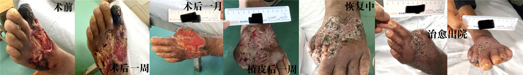 首先,由經(jīng)驗豐富的放射科介入團隊成功行下肢動脈硬化血管球囊擴張,血管開通后,陳先生的左下肢血流立刻恢復(fù)暢通;隨后,燒傷科為陳先生切除了左腳的干性壞疽,并給予潰瘍清創(chuàng)及腳面植皮;內(nèi)分泌科全程監(jiān)控,幫助患者控制血糖的同時,耐心換藥護理。