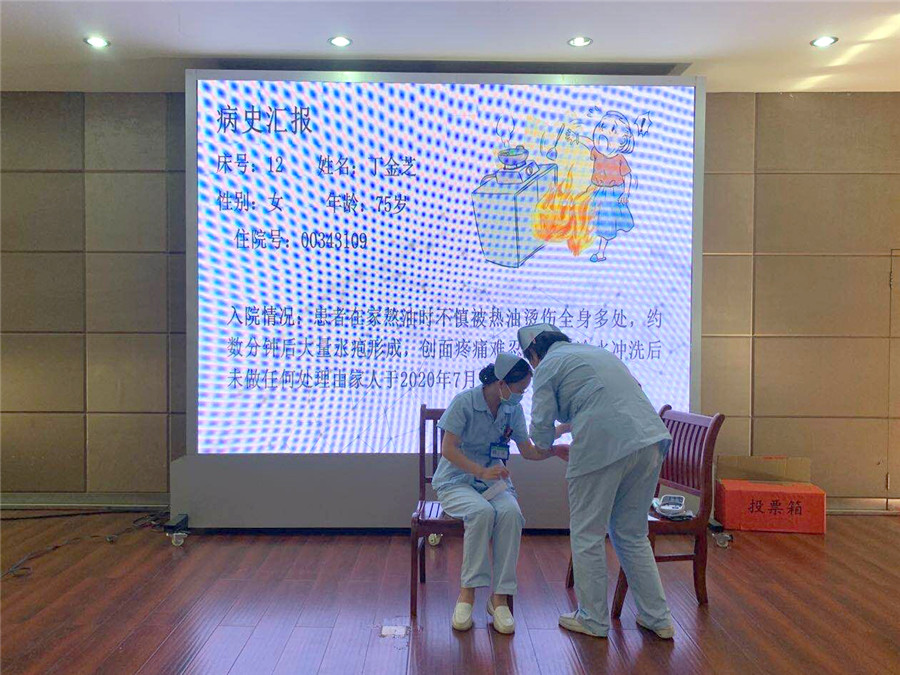 本次查房圍繞急診科一例25%燒傷病人展開,由副護(hù)士長(zhǎng)石嘉麗主持,責(zé)任護(hù)士朱琳主查,針對(duì)病人存在的護(hù)理問題提出護(hù)理診斷、并給予相應(yīng)的護(hù)理措施的同時(shí),還創(chuàng)新采取情景模擬的方式展現(xiàn)對(duì)病人的查體。討論階段,急診科護(hù)士就消毒隔離、發(fā)熱病人的護(hù)理以及休克期的護(hù)理提出了補(bǔ)充意見,進(jìn)一步完善護(hù)理措施,明確護(hù)理目標(biāo)。