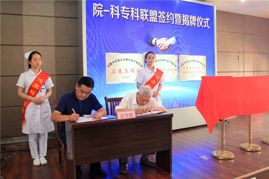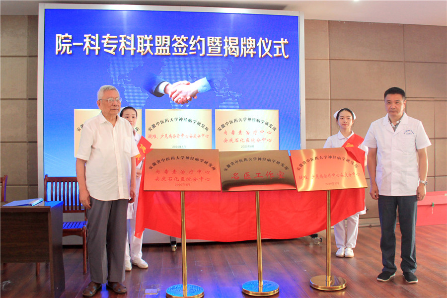 9月4日,南京鼓樓醫(yī)院集團(tuán)安慶市石化醫(yī)院神經(jīng)內(nèi)科與安徽中醫(yī)藥大學(xué)神經(jīng)病學(xué)研究所附屬醫(yī)院舉行院-科專科合作簽約儀式,在南京鼓樓醫(yī)院集團(tuán)安慶市石化醫(yī)院設(shè)立的“安徽中醫(yī)藥大學(xué)神經(jīng)病學(xué)研究所名醫(yī)工作室”、“安徽中醫(yī)藥大學(xué)神經(jīng)病學(xué)研究所疑難、少見(jiàn)病會(huì)診中心安慶分中心”和“安徽中醫(yī)藥大學(xué)神經(jīng)病學(xué)研究所肉毒素治療中心安慶石化醫(yī)院分中心”同步揭牌。