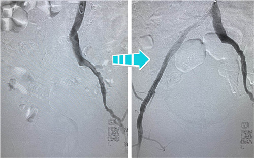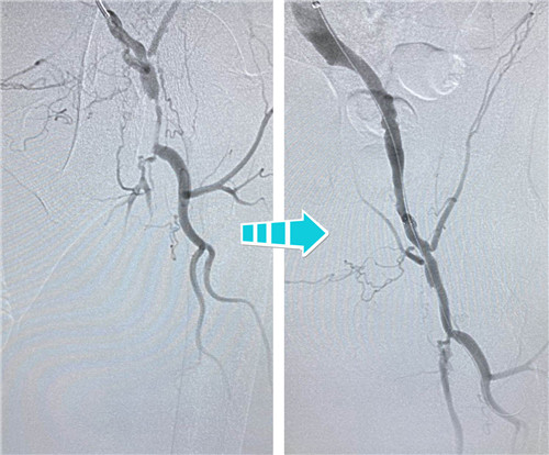 84歲的患者吳老原本只是走路時感覺小腿痛,慢慢地,他發(fā)現(xiàn)睡覺躺下時也疼得厲害,且有愈演愈烈的趨勢。入院完善相關(guān)檢查,這才找到腿疼的根源——竟然是血管堵住了!雙下肢血管造影顯示,吳老先生的情況不容樂觀,右側(cè)髂血管完全閉塞,左側(cè)髂血管重度狹窄,左側(cè)股淺開口以下同樣閉塞。如不及時治療,病情繼續(xù)惡化,皮膚會慢慢潰爛、發(fā)黑直至壞疽截肢。