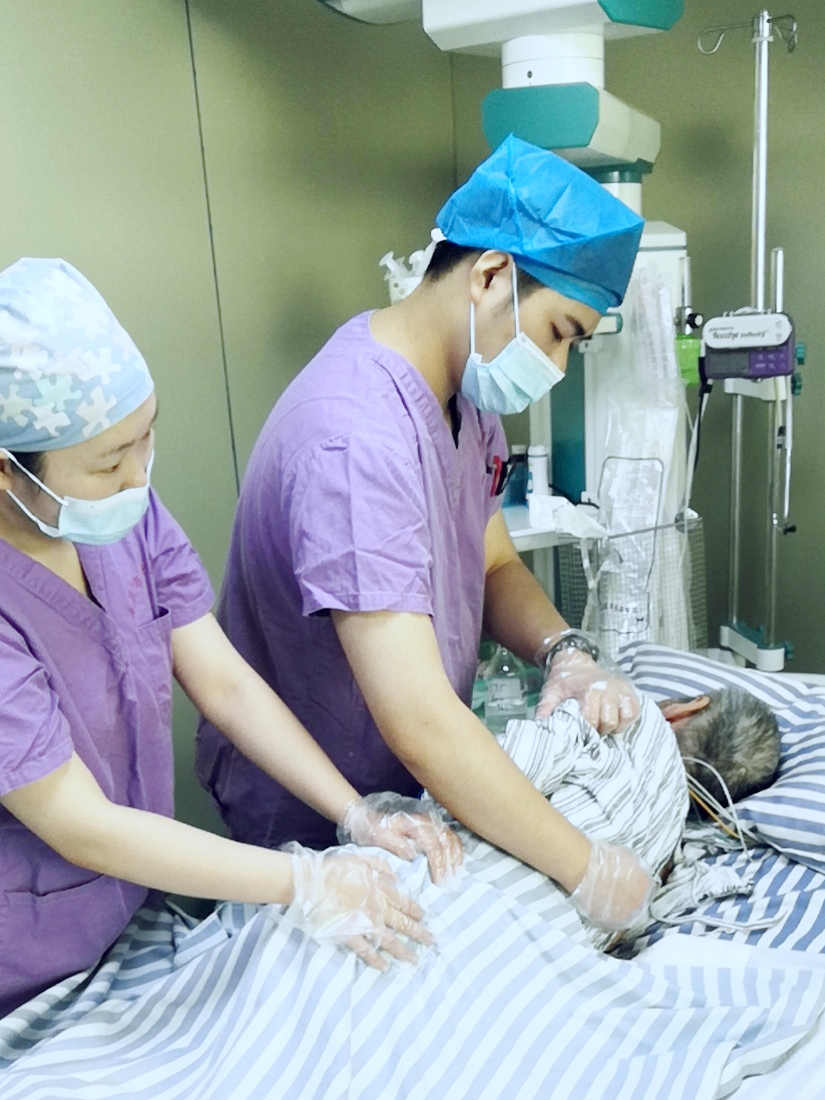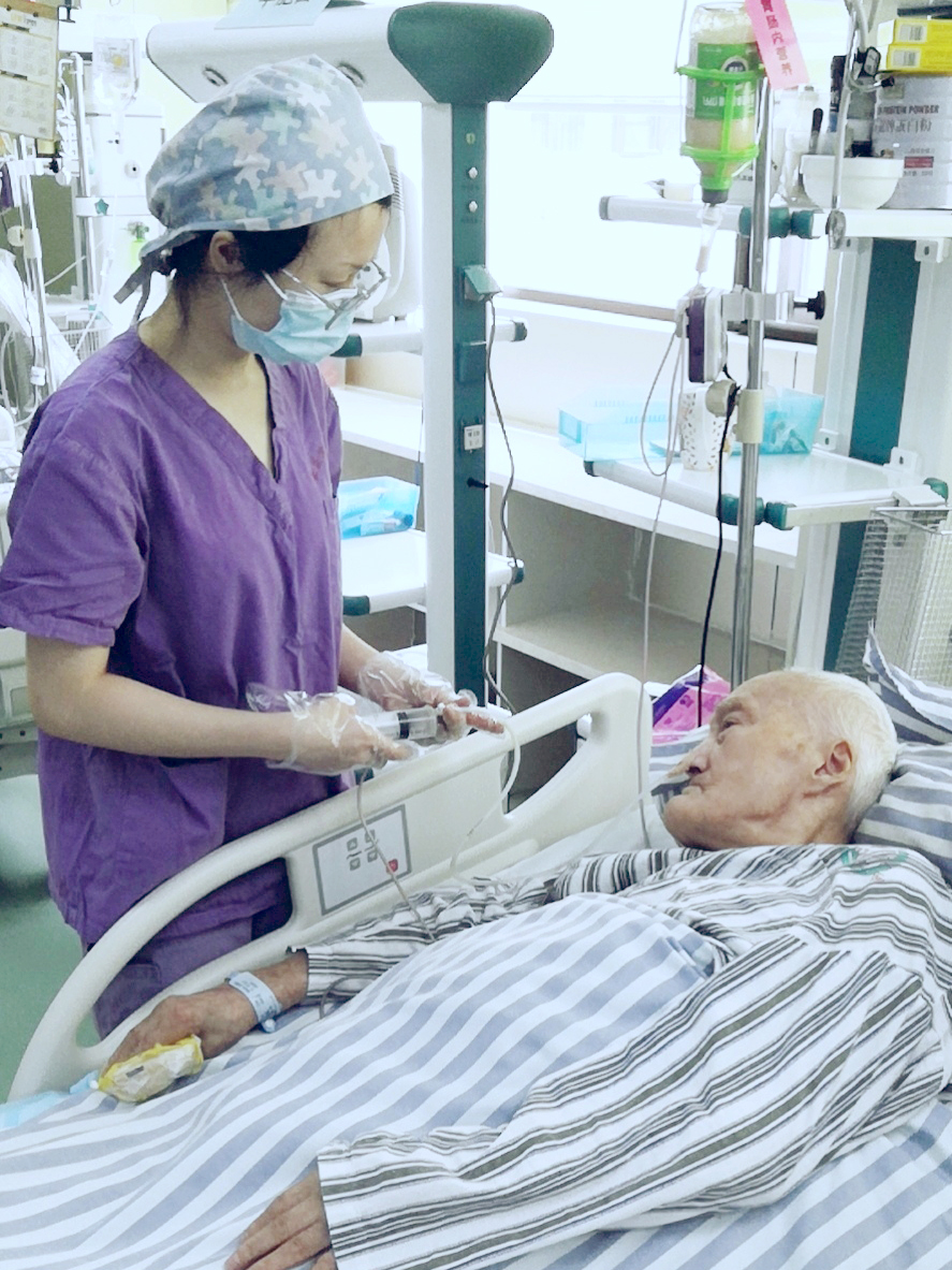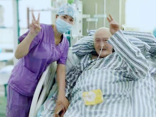 7床的爹爹是ICU里一個比較特別的患者,九十多歲的高齡,瘦弱的身軀,先后兩次徘徊在死亡的邊緣線,卻從未放棄與病魔抗爭。他還是ICU公認的最“潮”爹爹,最愛的解悶方式就是用手機看視頻,他樂觀向上的心態(tài)也感染了全科醫(yī)護人員。在ICU眾人的悉心照護和鼓勵下,他積極配合治療,始終堅強面對,病情逐漸穩(wěn)定。