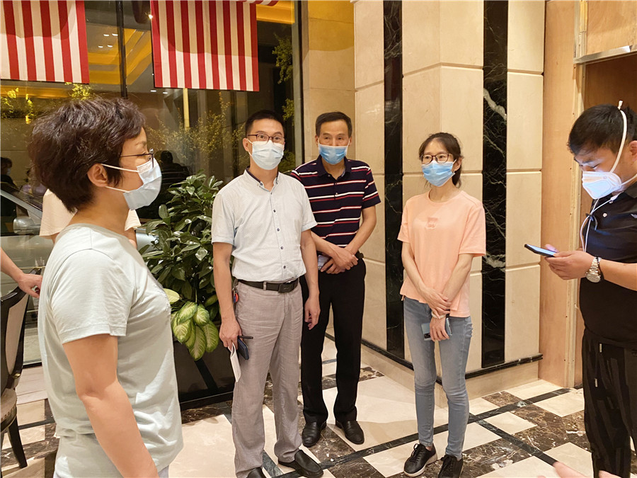 領(lǐng)隊彭鳳艷正在與當?shù)毓ぷ魅藛T討論隔離點具體工作流程