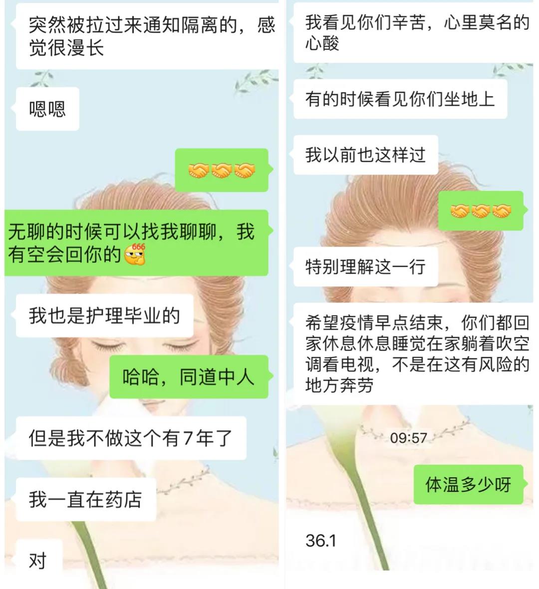 除了給予隔離人員實際的物質幫助外,我們另一項重要工作就是做好心理疏導,幫助隔離人員平穩(wěn)度過這個特殊時期。一位阿姨在隔離期間突然出現(xiàn)鼻塞頭暈乏力的癥狀,打電話向我們求助。我們的領隊彭鳳艷護士長一面貼心地安撫她的情緒,一面仔細詢問情況,及時上報。點位長和健康管理組組長綜合考量后,決定將阿姨轉運至醫(yī)院就診,王志遠醫(yī)生全程護送陪同。幸好阿姨并無大礙,沒過多久又被送回了隔離點。我和隊友劉牡丹一直和阿姨在微信上保持聯(lián)系,關心她的病情和生活,“阿姨,您不是一個人在戰(zhàn)斗哦!我們會一直陪著您!”看著阿姨又恢復了往日的精神,我們由衷地為她高興。
