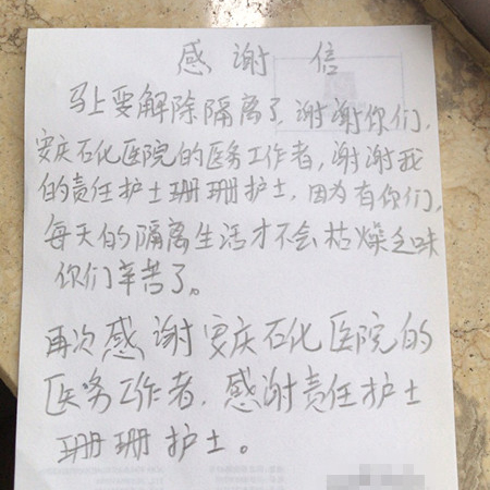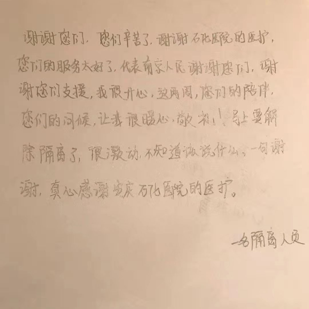 疫情當前,沖鋒一線守護百姓健康是我們醫(yī)護人員的職責(zé),忙碌之余,我們還收到了即將解除隔離人員送來的感謝信,字里行間都是真情,讓人倍感溫暖,這真是我們收到過最好的禮物了!