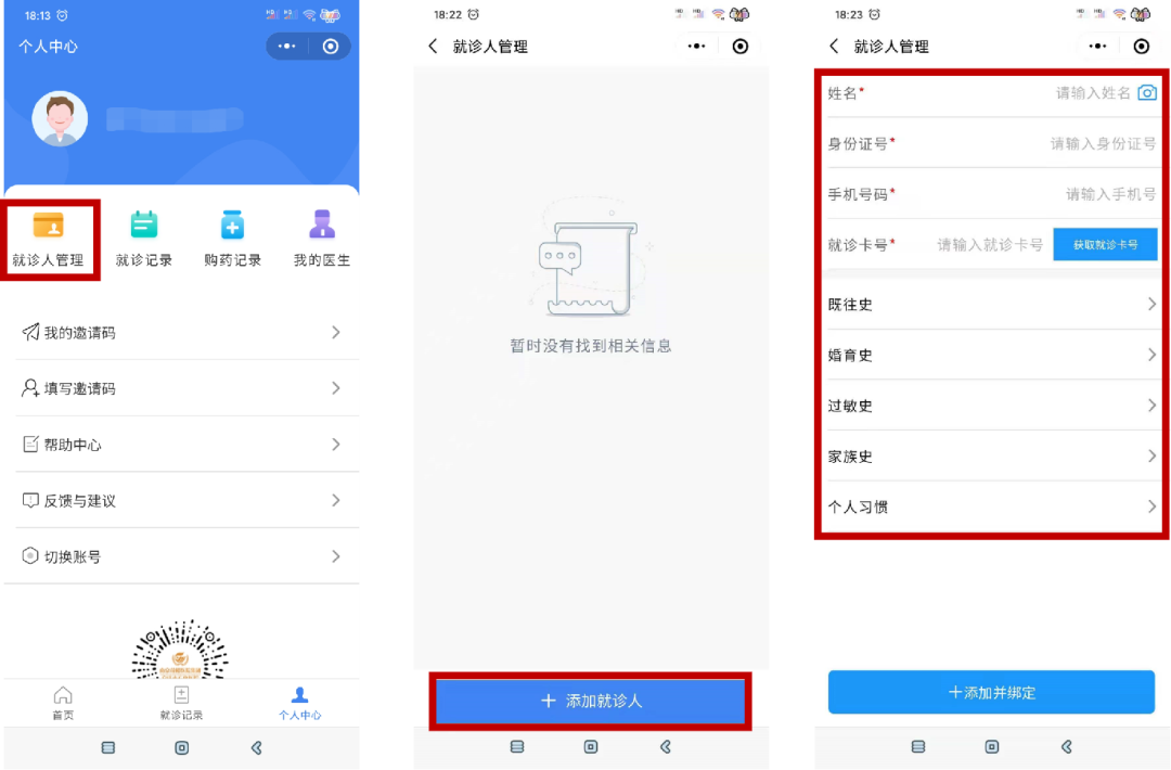 “就診人管理”-“添加就診人”-“添加并綁定”