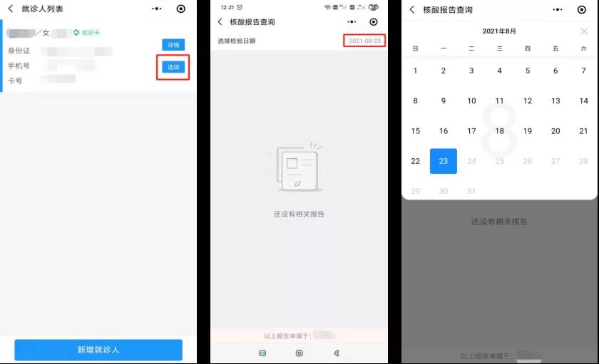 選擇就診人、核酸檢測時間,進行報告查看