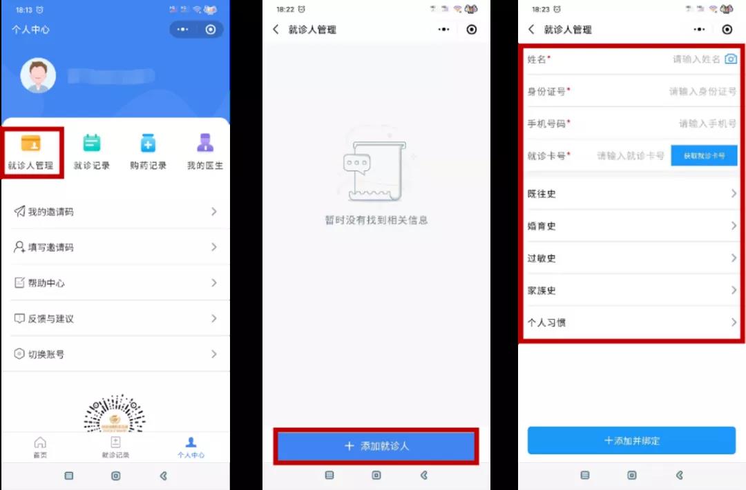“就診人管理”-“添加就診人”-“添加并綁定”