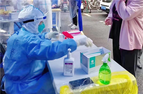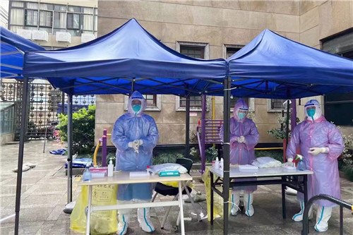 晚上10:00,援滬醫(yī)療隊(duì)從石化醫(yī)院乘坐大巴出發(fā)。路上,領(lǐng)隊(duì)疏平再次為所有隊(duì)員進(jìn)行防護(hù)知識培訓(xùn),并交代采集任務(wù)相關(guān)注意事項(xiàng)。次日凌晨5:45 抵達(dá)上海市靜安區(qū)。隊(duì)員們僅在車上簡單進(jìn)食、稍作休息,就立即投入核酸采集工作中。