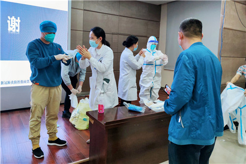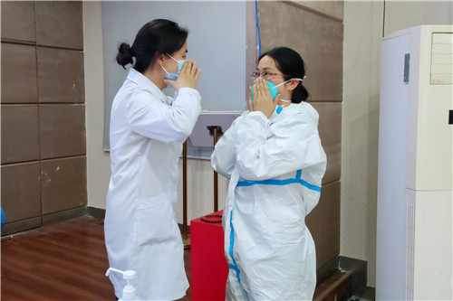 出發(fā)前,院感辦陳麗娟主任及程宏蘭老師為隊(duì)員們再一次強(qiáng)化培訓(xùn),講解注意事項(xiàng),進(jìn)行一對一指導(dǎo),反復(fù)練習(xí)穿脫防護(hù)服及核酸采樣技術(shù)操作,確保人人過關(guān)。