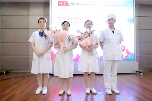 年輕護(hù)士代表向在崗滿30年的護(hù)理前輩吳清華、王英送上鮮花并致敬,感謝她們兢兢業(yè)業(yè)、任勞任怨,為醫(yī)院發(fā)展奉獻(xiàn)光和熱。