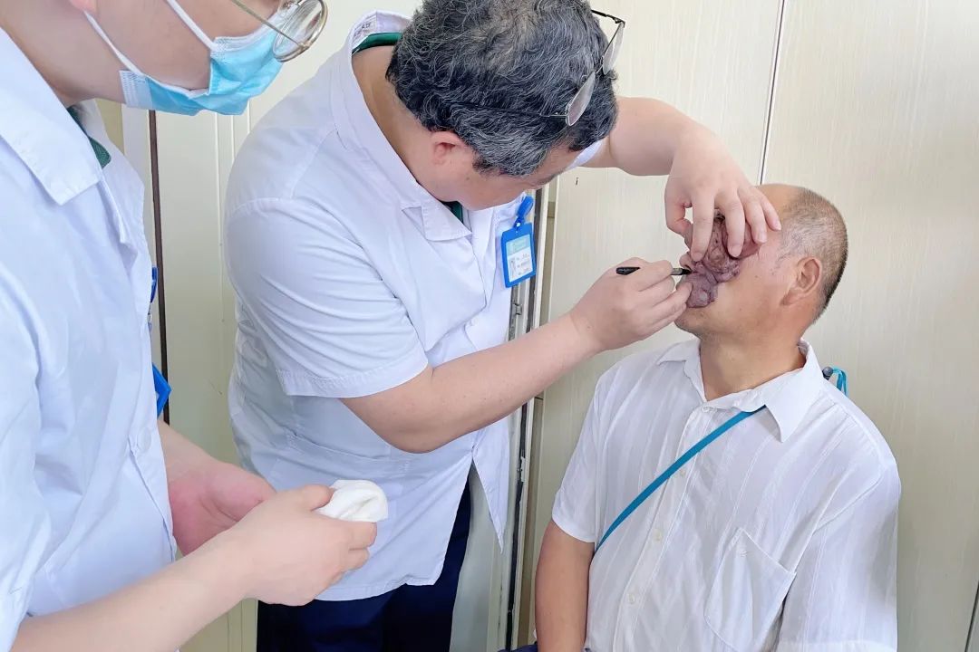 在專家門診診室內,譚謙教授和石化醫(yī)院燒傷整形一病區(qū)主任李江虹正在認真查看張先生的面部情況。原來,張先生左側面部的贅生物自嬰幼兒時期就持續(xù)增長,40余年時間長至約5cm×5cm大小,未進行規(guī)律診治。近10年,增生速度明顯加快,體積變大,垂于面部,嚴重影響日常生活,張先生希望可以通過手術改善。