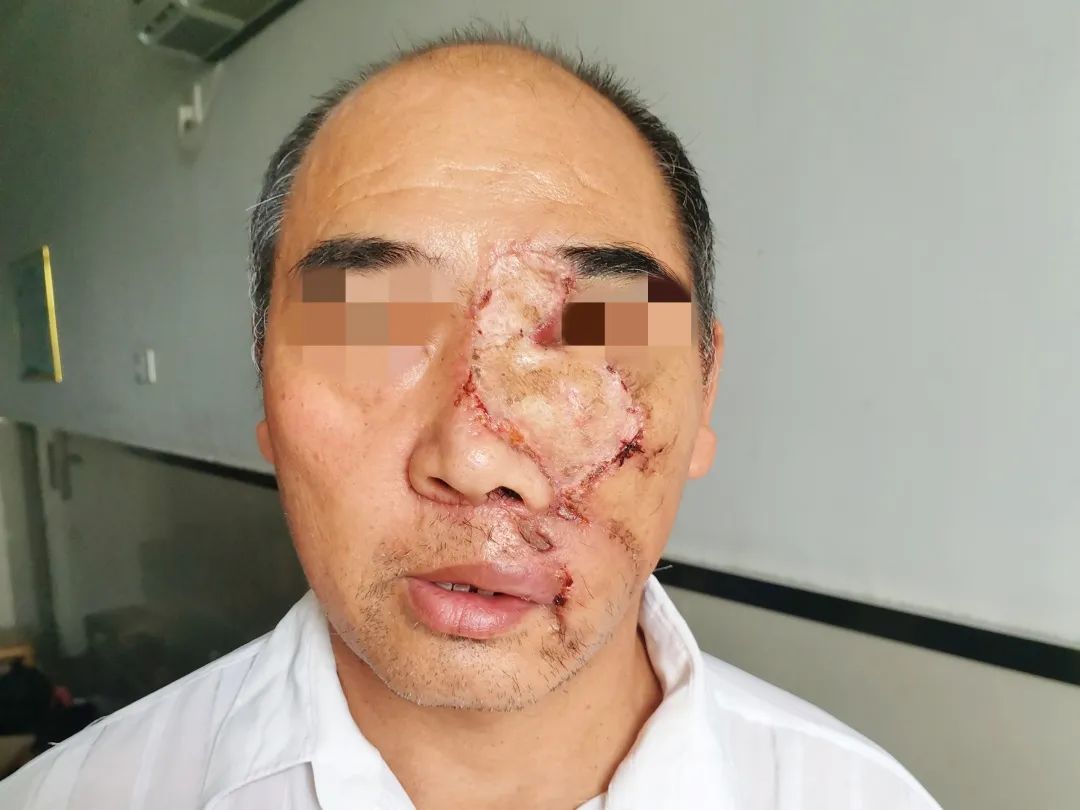 術后,李江虹主任帶領床位醫(yī)生汪趙彬每日查房,仔細觀察張先生術區(qū)出血情況以及創(chuàng)面愈合、皮瓣存活程度,及時調整用藥。在全科醫(yī)護的精心治療護理下,張先生左側面部的皮瓣、全厚皮與創(chuàng)面融合良好,血供正常,順利出院。