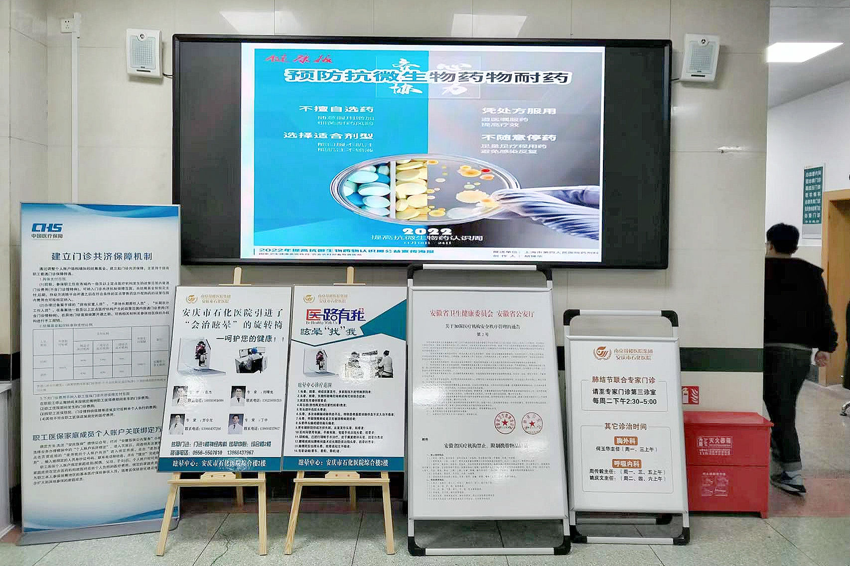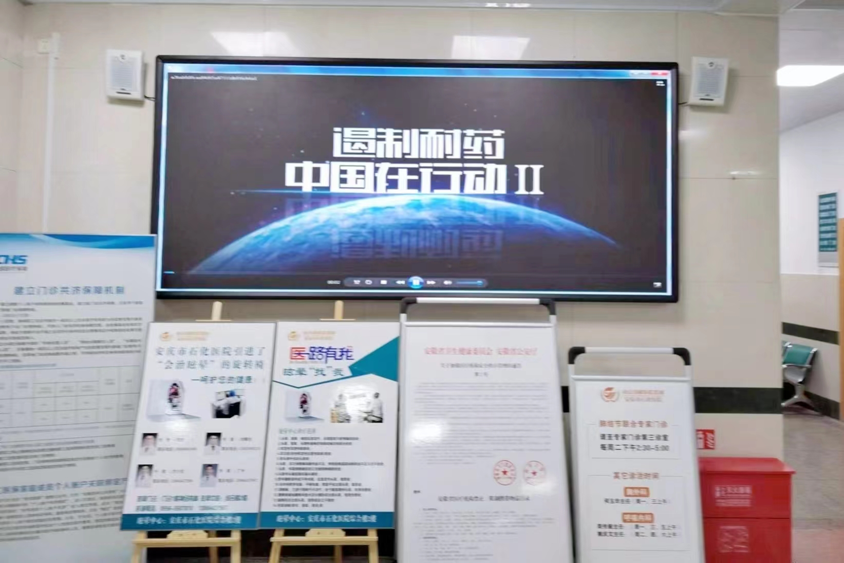 利用門診候診大廳顯示屏全天候滾動(dòng)播放“2022年提高抗微生物藥物認(rèn)識(shí)周”宣傳海報(bào)和視頻。