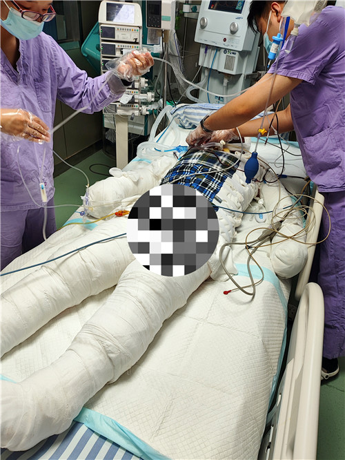 “可以救,趕緊送過(guò)來(lái)吧!”放下電話,石化醫(yī)院急診科和燒傷整形一病區(qū)立刻開始準(zhǔn)備。一位工人因車間起火,火焰燒傷全身多處2小時(shí)致體表80%-90%燒傷。