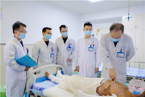 在患者病情穩(wěn)定后,李主任又帶領(lǐng)團(tuán)隊(duì)先后2次為其行受壓處及關(guān)節(jié)活動(dòng)處創(chuàng)面植皮。經(jīng)過(guò)燒傷整形一病區(qū)團(tuán)隊(duì)的不懈努力和精心護(hù)理,成功將患者從死亡邊緣救回。