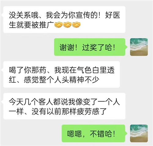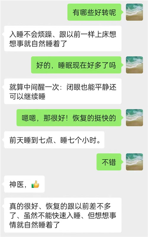 吃藥一周后,患者病情明顯好轉(zhuǎn),每天能睡六七個小時,兩周后患者失眠癥狀消失。在微信中,他表達了對李醫(yī)生的感謝。