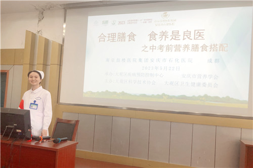 走進(jìn)課堂,在“宣”字上鉚勁,助力中考氛圍濃。體檢中心副護(hù)士長史秋霞、普通外科主管護(hù)師成群、麻醉科護(hù)士方嬌嬌一行3人走進(jìn)石化一中初三畢業(yè)班,以"合理膳食 食養(yǎng)是良醫(yī)——中考營養(yǎng)膳食”為主題,通過線下授課+網(wǎng)絡(luò)直播的方式展開宣講。從合理膳食的定義、注意事項、健康飲水、中考食養(yǎng)誤區(qū)以及迎考健康飲食指南等多方面詳細(xì)講解,讓師生們更加直觀地感受到健康飲食習(xí)慣和合理營養(yǎng)膳食配比的重要性,受到師生們的一致好評。