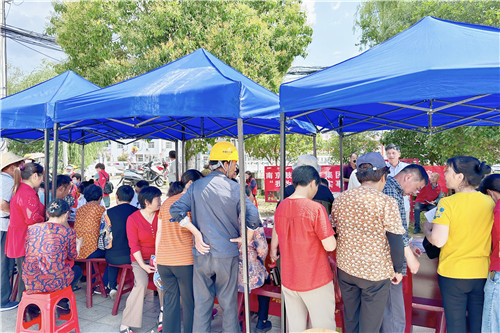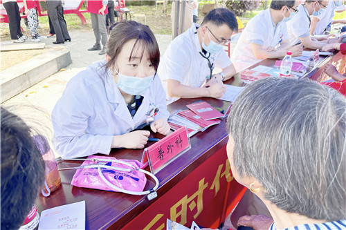 塔畈鄉(xiāng)政府門前排隊等候的村民翹首以盼,由石化醫(yī)院9個科室14名醫(yī)護人員組成的專家隊伍驅(qū)車2小時到達后,立即投入義診。