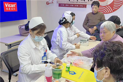 消化內(nèi)科副主任護師王銀根及護理雙主體教改班學生志愿者為居民們免費測量血壓、血糖,普及消化道疾病預防與保健知識,提醒大家早發(fā)現(xiàn)、早診斷、早治療。