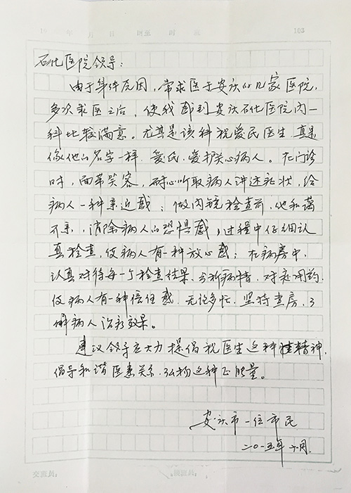 11月12日,我院周長江院長收到一封未署名市民來信。信中,該市民對我院消化內(nèi)科的醫(yī)療技術(shù)水平和醫(yī)療服務(wù)質(zhì)量給予高度肯定,并特別表揚(yáng)了該科的祝愛民醫(yī)生。
