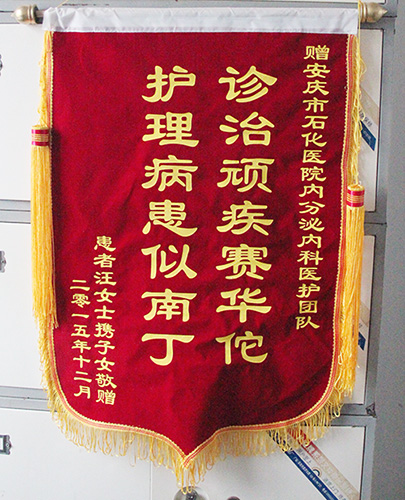 近日,患者汪女士的子女替母親向我院內(nèi)分泌科和心血管內(nèi)科全體醫(yī)護送上錦旗,贊揚他們的高超醫(yī)技和精心護理,感謝他們對老人無微不至的照料。