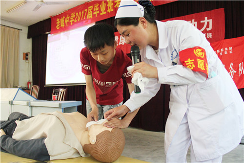 活動中,護理干事陳麗娟擔任解說員,將急救的基本知識及相關措施做了詳細解說。志愿者劉風英護士長則根據(jù)授課內(nèi)容為孩子們示范操作,言傳身教,加深了孩子們對急救知識的理解和實際應用。與此同時,針對高年級學生中考焦慮問題,花杰副院長結合實際生活案例和臨床經(jīng)驗,將考前焦慮的應對和預防向同學們娓娓道來,現(xiàn)場學習氛圍濃厚,起到良好的培訓效果。