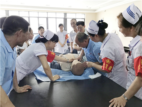 志愿者劉風(fēng)英和陳麗娟為敬老院的護(hù)理員們培訓(xùn)心肺復(fù)蘇和誤吸的急救處理技能,并指導(dǎo)他們進(jìn)行模型練習(xí)。
