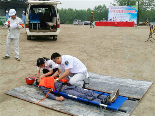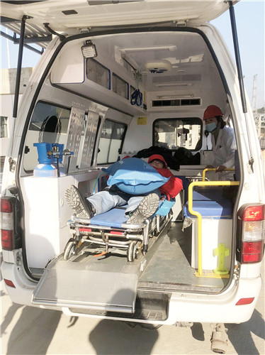 接命令不到1分鐘,醫(yī)護(hù)人員立即配備救援和防護(hù)裝置奔赴事故現(xiàn)場(chǎng)。一名受傷施工人員躺在地上,雖已得到初步處置,但效果并不樂(lè)觀。醫(yī)療救援小分隊(duì)進(jìn)入現(xiàn)場(chǎng)后,首先對(duì)周邊環(huán)境進(jìn)行了評(píng)估,確保安全后,醫(yī)護(hù)人員立即展開(kāi)搶救工作。王志遠(yuǎn)醫(yī)生拿出聽(tīng)診器給患者進(jìn)行初步檢查,監(jiān)測(cè)生命體征并詢問(wèn)患者傷情,護(hù)士朱琳迅速脫去患者身上污染的衣服,開(kāi)放氣道、吸氧、建立靜脈通道,協(xié)助擔(dān)架員將患者緊急轉(zhuǎn)送至醫(yī)院。