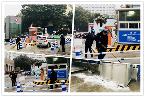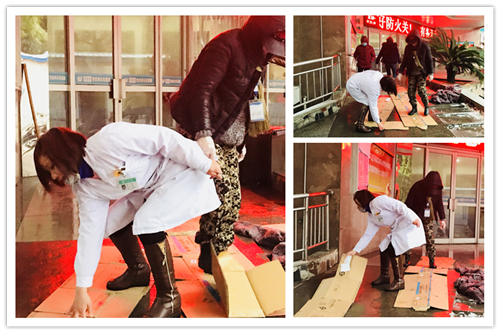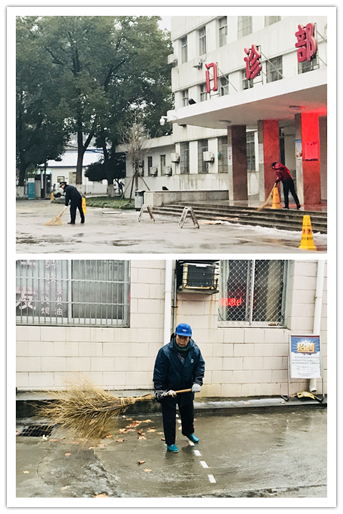 1月25日清晨地面濕滑,部分路面上凍,有很多醫(yī)護人員都選擇了走路上班。為保障患者和員工的健康安全,預防暴雪來臨,我院高度重視,積極應對,保安、保潔人員不厭其煩、一遍遍清掃主干道路積雪、冰碴,嚴防進一步結冰;行政綜合科工作人員在濕滑的臺階、路面鋪墊紙板、布塊,做好一切防滑措施。