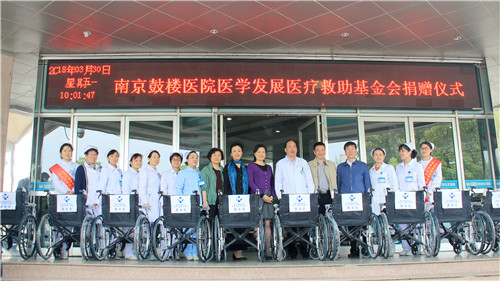 捐贈儀式上,南京鼓樓醫(yī)院醫(yī)學(xué)發(fā)展醫(yī)療救助基金會理事長韋寧華、秘書長齊曉敏、理事伊彭和王斯瑤代表基金會,向南京鼓樓醫(yī)院集團安慶市石化醫(yī)院捐贈十把輪椅。