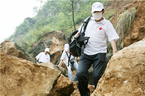 翻看當(dāng)年醫(yī)療隊(duì)留下的資料,其中一張照片非常感人。坍塌山體的碎石間,一個醫(yī)生背著大大的醫(yī)療包,盡力彎著身子,左手牢牢抓著一位老鄉(xiāng)手臂,兩人一個低著頭,一個背著身,都看不見臉上的表情,但是伸手間傳遞的濃濃魚水之情一下子就觸動了觀者,從身形,判斷出這是普外科主任吳爾水。