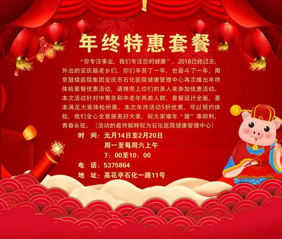 2018已經(jīng)過去,外出的安慶籍老鄉(xiāng)們,你們辛苦了一年,也奮斗了一年,南京鼓樓醫(yī)院集團安慶市石化醫(yī)院體檢中心再次推出年終體檢套餐優(yōu)惠活動,請攜帶上你們的親人來參加!
