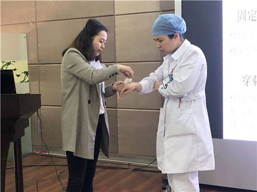 此次學(xué)習(xí)班邀請(qǐng)了安徽省靜脈治療護(hù)理專業(yè)委員會(huì)副主任委員、合肥市第一人民醫(yī)院護(hù)理部潘愛紅主任及林華高級(jí)講師汪成鳳老師授課。潘主任以“2019年以循證醫(yī)學(xué)為基礎(chǔ)的靜脈輸液實(shí)踐指南”為題授課,從技術(shù)培訓(xùn)、合理應(yīng)用、科學(xué)宣教、質(zhì)量控制、更新觀念五個(gè)方面,結(jié)合2016INS指南解讀了靜脈輸液安全管理方面的知識(shí),分享了合肥市第一人民醫(yī)院開展“靜療規(guī)范”的經(jīng)驗(yàn)。汪成鳳講師現(xiàn)場演示留置針防堵管十步操作法,并講解了留置針相關(guān)并發(fā)癥及對(duì)應(yīng)處理措施。